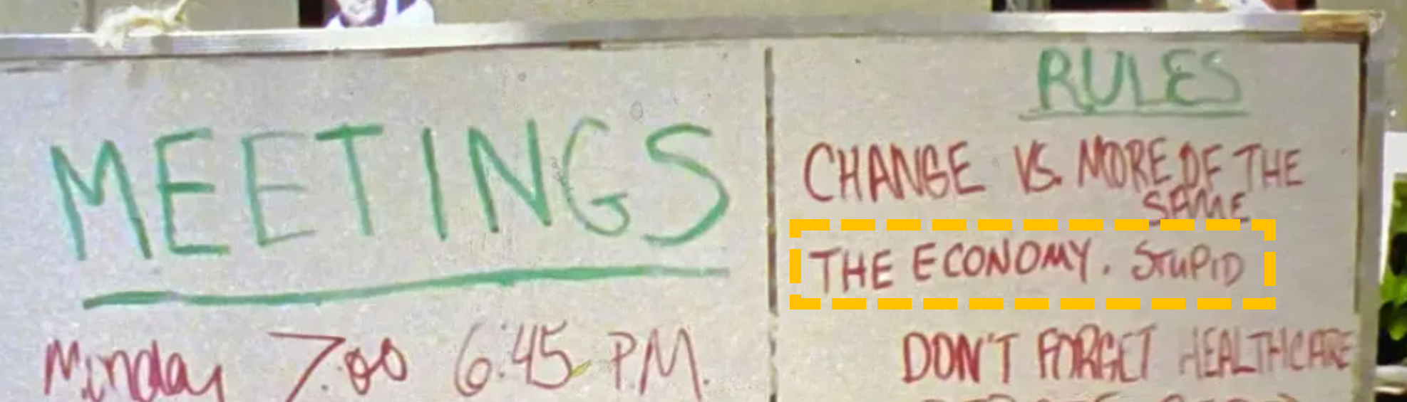 Uppmaningen - på svenska ungefär Ekonomin, pucko! - var tänkt som en ständig påminnelse till valarbetarna att betona ekonomiska frågor. Den sittande presidenten George H. W. Bush hade nämligen länge haft ett massivt stöd bland amerikanerna, men just under valåret försämrades landets ekonomi - och Clinton förstod instinktivt att pengar i slutändan brukar avgöra hur folk röstar.