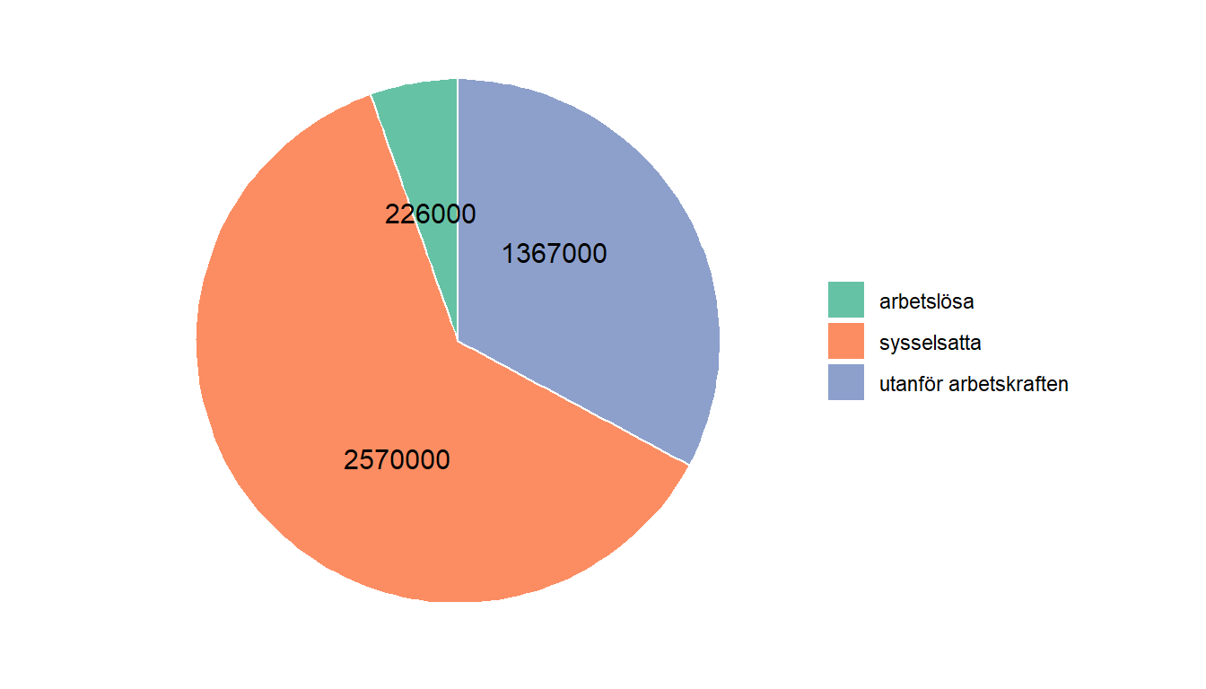 Du räknas alltså som sysselsatt om du har jobbat minst en timme under den vecka som mätningen görs. Om du däremot säger att du inte har ett jobb men aktivt söker, så räknas du som arbetslös. Tillsammans kallas de som är sysselsatta eller arbetslösa för arbetskraften. Resten står utanför arbetskraften. Hit hör bland annat pensionärer, studenter och personer som känner att det inte längre är någon idé att söka efter jobb. Så här såg arbetsmarknaden ut i november 2024 för personer mellan 15 och 74 år.