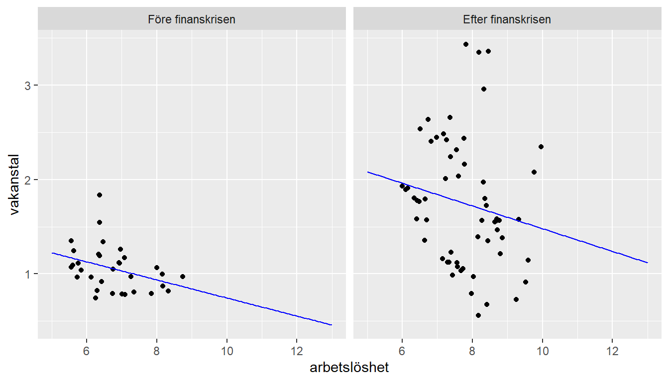 I båda figurerna finns ett ganska tydligt negativt samband mellan lediga jobb och arbetslöshet: När det finns många lediga jobb är arbetslösheten oftast låg och när det finns få lediga jobb går många arbetslösa. Detta negativa samband kallas för Beveridgekurvan och åskådliggörs av de blå linjerna i figuren.