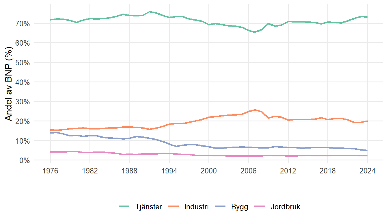 “…av alla…” I verkligheten tillverkas såklart inte bara bröd utan tusentals olika varor och tjänster. All produktion ska räknas in: bröd, jordgubbar, snus, toapapper, hårklippningar, cancermediciner, fyrar och så vidare. BNP-måttet säger med andra ord ingenting om VAD vi producerar. I vår första modell handlade det om bröd, men det kunde lika gärna vara kemiska stridsvapen, cancermediciner för barn eller vård av äldre. I följande figur ser du vad BNP har bestått av i Finland under perioden 1976–2024.