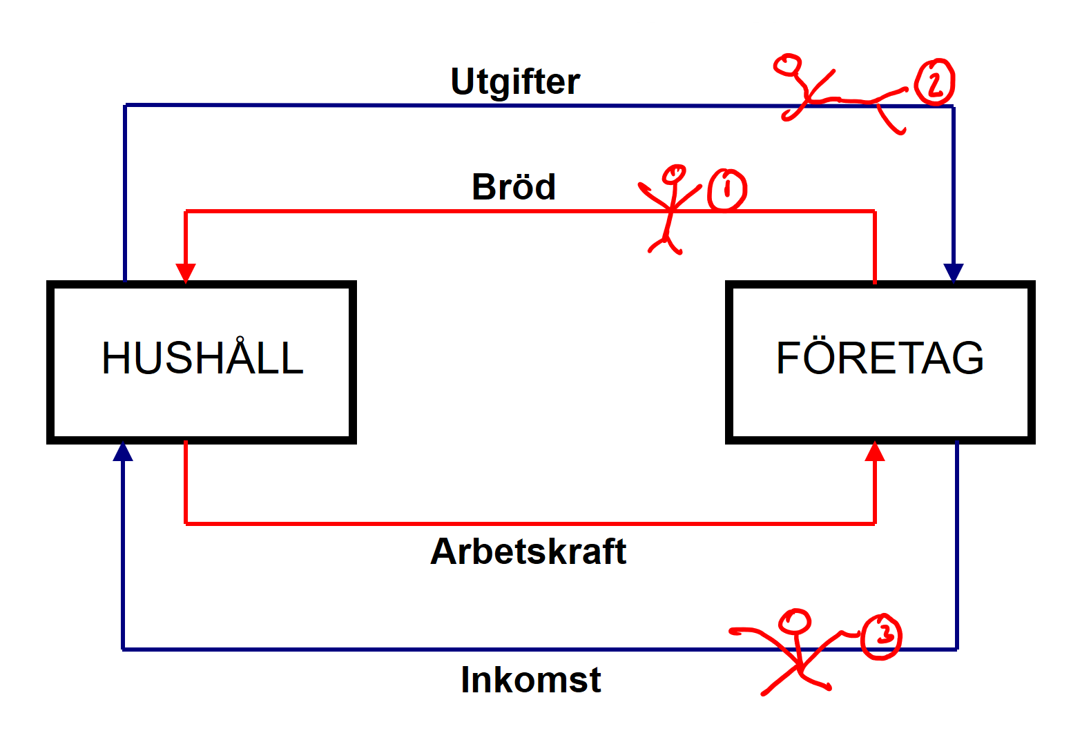 De blå pilarna visar i stället hur pengar flödar inom ekonomin. Arbetarna går till jobbet eftersom de får lön, vilket i figuren innebär att företagen skickar inkomster tillbaka till hushållen som tack för att de har arbetat. Samtidigt strömmar brödet från företagen till hushållen - men inte av välvilja utan för att hushållen betalar för brödet. Därför flödar utgifter från hushållen till företagen.