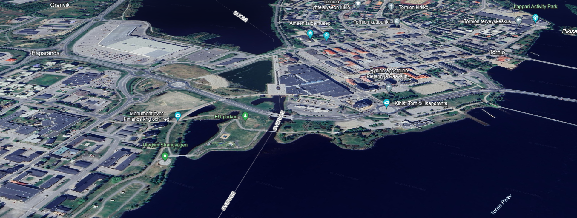 Deh här kartan visar hur ser ut vid gränsen mellan Sverige och Finland längst upp i Bottenviken. Till vänster ser du Haparanda, till höger Torneå.