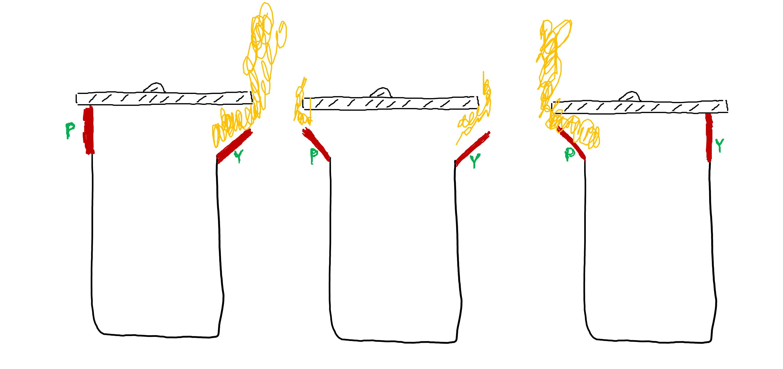I kastrullen längst till vänster har vi stängt igen P-öppningen. All ånga sprutar därför ut våldsamt genom Y-öppningen – det finns helt enkelt ingen annanstans att ta vägen eftersom P är “låst”. I kastrullen längst till höger är däremot Y-hålet stängt, och all ånga strömmar ut genom P-öppningen. I mitten har du en kastrull där båda hålen är öppna och därför kommer det lite ånga ur både P och Y.