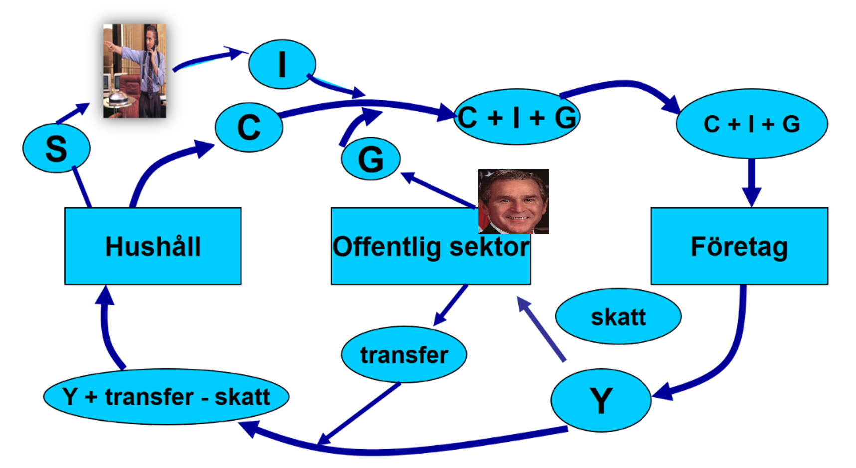 En direkt åtgärd vore att öka den offentliga konsumtionen (G). Han kan till exempel se till att staten bygger ut försvaret eller storsatsar på skolan och sjukvården. Men Bush kan också påverka hur mycket hushållen vill konsumera. Om han sänker skatterna och/eller ökar transfereringarna, så får ju hushållen en större disponibel inkomst och med mera pengar i plånboken vill de troligen också konsumera mer.