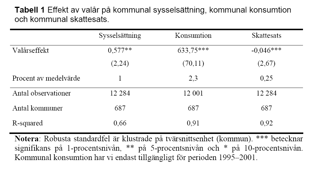 Om politiker agerar på det här sättet så kommer ekonomin ofta att blomstra just på valdagen. Vi får i så fall så kallade politiska konjunkturcykler. Finns det tecken på att politiker faktiskt missbrukar sin makt för egen vinning? I tabellen nedan har Dahlberg & Mörk (2008) följt alla kommuner i Finland och i Sverige under cirka 18 år och undersökt om det händer någonting speciellt i finanspolitiken i samband med politiska val. Resultaten är tydliga: Just under valåren anställer kommunerna överlag fler människor, de ökar sin offentliga konsumtion och de sänker skatterna.