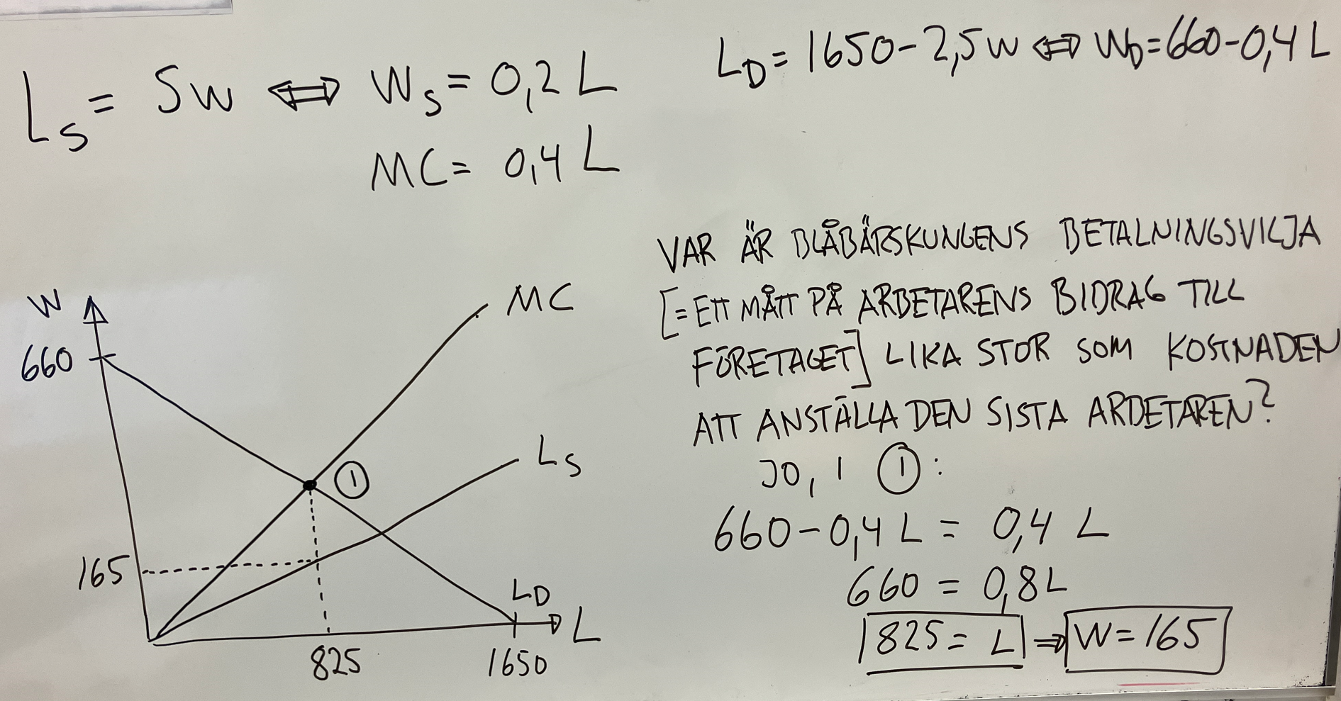 Det här är förmodligen den allra svåraste frågan under kursen. Här råder nu monopsoni: Det finns bara ett enda företag som köper arbetare (tänk “Blåbärskungen”). Företaget kan nu välja var på utbudskurvan man vill ligga: Köpa få arbetare och betala en låg lön eller köpa många arbetare och betala en hög lön. För att anställa ytterligare en arbetare måste jag locka den människan med en högre lön (enligt utbudskurvan), men det innebär också att jag måste höja lönen för alla andra arbetare. Det här innebär att Blåbärskungens MC-kurva börjar i samma punkt som utbudskurvan men sedan stiger dubbelt så snabbt som utbudskurvan. Vinstmaximering sker där den sist anställde arbetaren bidrar med lika mycket till företaget som det kostar att anställa den människan. Jag använder sedan utbudskurvan för att se vilken lön som krävs för att locka så många arbetare. Se figur och uträkningar: