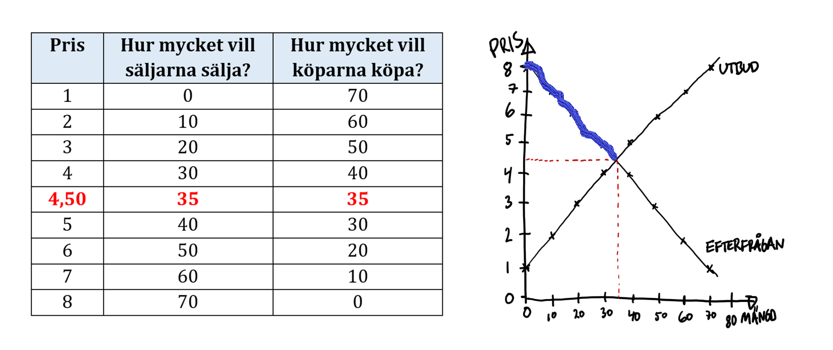 - Rita in efterfrågan och utbudet i en figur där du har lönen på den vertikala axeln och mängden på den horisontella. Utifrån din figur: Ungefär hur hög blir lönen och hur många får jobb, givet att det råder konkurrens på marknaden?
