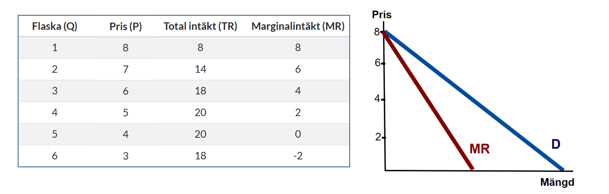 Tänk så här: Efterfrågekurvan visar världens efterfråga på champagne, men eftersom det bara finns en enda producent är det här också efterfrågan på din champagne. Kunderna har ingen annanstans att gå än till dig. Du kan alltså välja var på kurvan du vill sälja: Dyrt och lite eller mycket och billigt. Om du till exempel sätter priset till 8 euro så säljer du bara en flaska, vilket ger dig intäkterna 8 euro. För att sälja två flaskor måste du sänka priset till 7 euro. Intäkterna blir därmed 14 euro. Att sälja två flaskor i stället för bara en gjorde alltså att intäkterna ökade från 8 till 14 euro. Marginalintäkten MR är därmed 6 euro. Att sälja ytterligare en flaska gör att du måste sänka priset ytterligare. Du säljer mer (vilket är bra!) men du säljer varenda flaska till ett lägre pris (vilket är dåligt!). Notera därför att MR-kurvan börjar i samma punkt som efterfrågekurvan men sedan faller snabbare än efterfrågekurvan. Det här beror på att monopolisten - för att sälja en flaska till - måste sänka priset inte bara på den flaskan utan på alla flaskor.