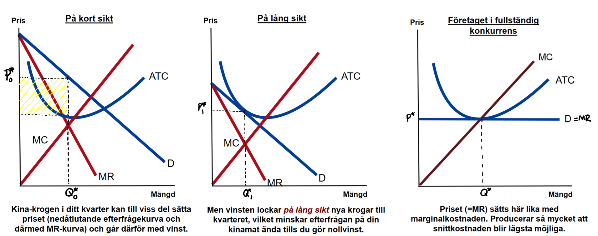 - Det finns 25 varianter av cigaretter och 34 varianter av tandkräm… är det bra eller dåligt? Min farmor tyckte att det var idiotiskt: “Varför finns det 34 företag som allihopa tillverkar tandkräm? Vore det inte smartare om man i stället hade ett stort företag som tillverkar all tandkräm?!” Farmor hade rätt! Titta på bilden här nedanför. Längst till vänster ser du läget vid monopolistisk konkurrens på kort sikt: Bolaget sätter ett högt pris och gör en stor vinst. I mitten ser du läget på lång sikt, när nya företag har trängt in på marknaden för att få ta del av de stora vinsterna. Nu har det kommit in så många nya cigarettmärken/tandkrämstillverkare att varje enskilt företag gör nollvinst (och därför kommer inga fler bolag att vilja komma in på marknaden). Som du ser i mittenbilden så är egentligen situationen inte optimal. Det är som att varje företag tillverkar “för lite”: ytterligare en tandkrämstub skulle ju värdesättas mer av en kund än den skulle kosta att producera, och företaget tillverkar för lite för att kostnaden per enhet ska vara på sin lägsta nivå. Längst till höger ser du hur det ser ut för ett företag på en marknad med fullständig konkurrens. Monopolistisk konkurrens ger alltså en massa företag som var och en sätter lite för högt pris (eftersom de har “monopol” på sin nisch) och producerar lite för lite. Dessa nackdelar ska dock vägas mot att vi faktiskt får ett mer varierat utbud av produkter. Som konsument kanske du uppskattar att det finns många olika slags flingor i butiken och inte bara en?