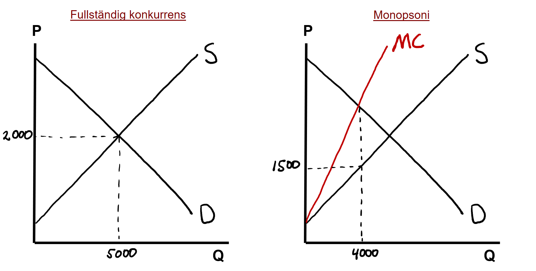 - Figuren nedan vissa arbetsmarknaden vid fullständig konkurrens respektive vid monoponi. Notera att utbudskurvan vid monopsoni visar hur många som vill sälja sin arbetskraft till just detta enda företag (tänk Blåbärskungen). Företaget kan därför välja hur många arbetare man vill köpa: Få och billigt eller många och dyrt? Hitta alltså punkten där den sista arbetaren bidrar med lika mycket värde som det kostar att anställa just den människan (MR=MC). Sen kan du utnyttja utbudskurvan för att se vilken lön människor kräver. Notera att monopsoni leder till lägre lön och färre anställda än vid fullständig konkurrens.