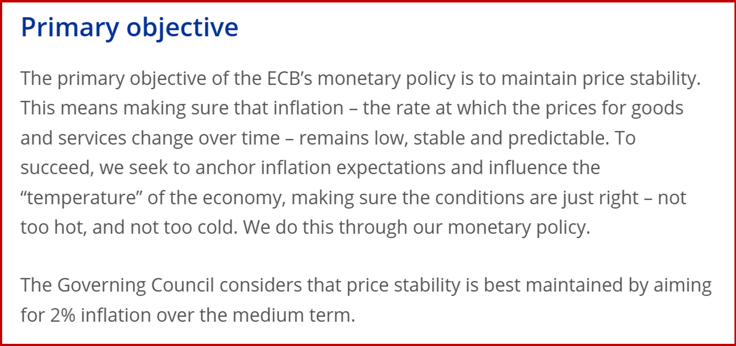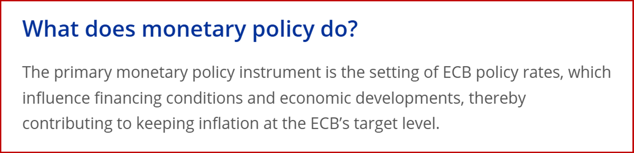 Målet för Christine Lagarde är alltså “stabila priser” i EMU-länderna, vilket ECB tolkar som att KPI ska stiga med cirka 2 procent per år. Men vad innebär egentligen penningpolitik? Så här beskriver ECB det: