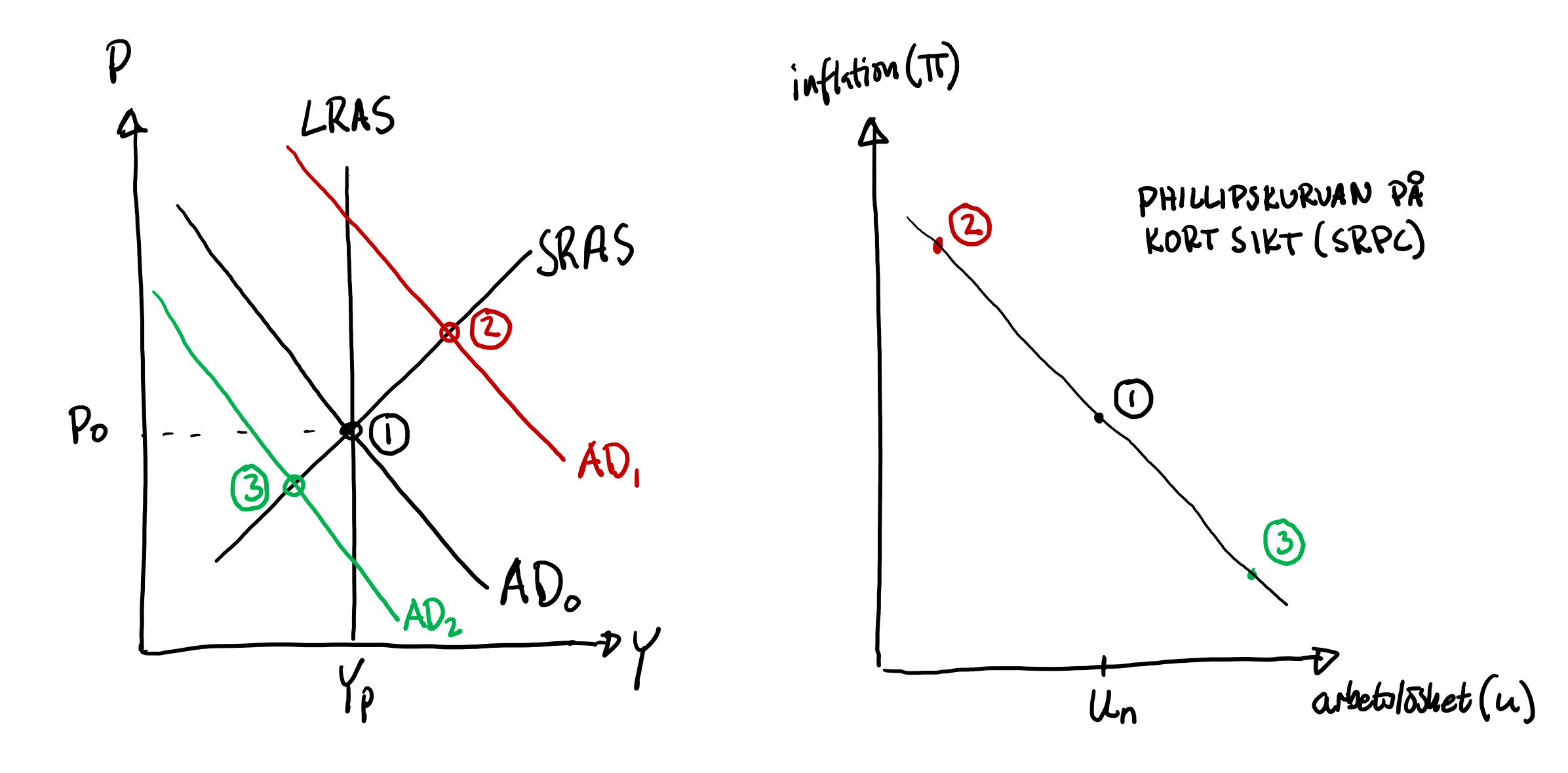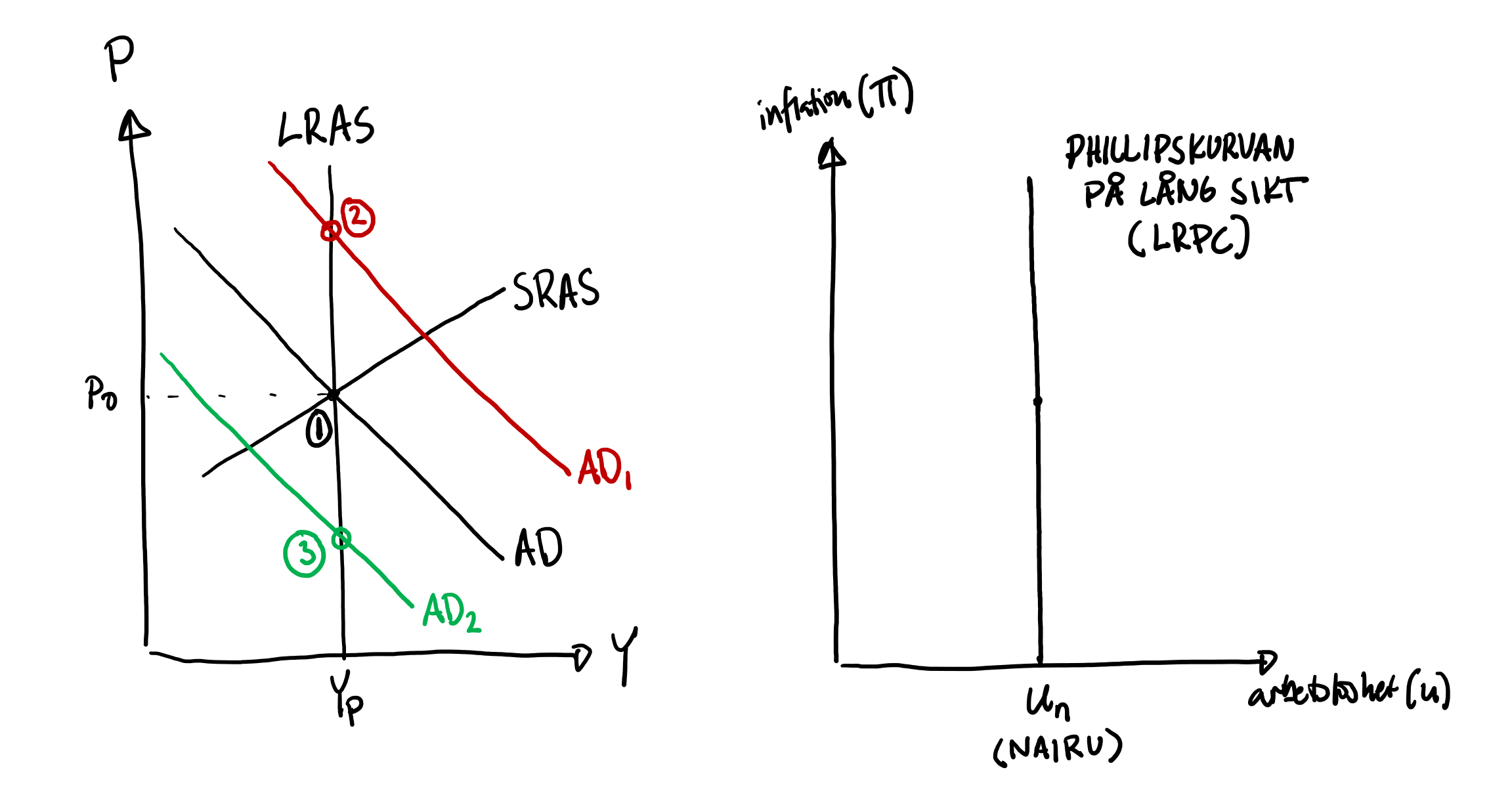 Till vänster i figuren ser du AD-AS-modellen. Vi utgår från punkt 1, där vi befinner oss i långsiktig jämvikt. Till höger finns en ny typ av figur, där jag har inflationen på den vertikala axeln och arbetslösheten på den horisontella. I detta utgångsläge (punkt 1) är vi i långsiktig jämvikt - vilket innebär att vi varken befinner oss i hög- eller lågkonjunktur. All arbetslöshet vid denna tidpunkt är således “naturlig”; det här är den arbetslöshet som vi kan förvänta oss “i långa loppet”.