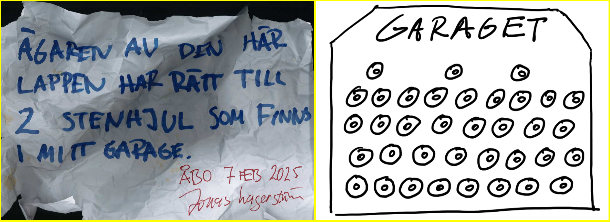 I stället för att släpa med mig stenhjulen på min shoppingrunda, så betalade jag med en lapp. Den som fick lappen kunde i sin tur betala med lappen när hon eller han vill köpa något - eller när som helst komma hem till mitt garage och växla lappen mot sina stenhjul. Men det är sällan någon vill hämta ut sina hjul; oftast ligger de bara där i garaget och samlar damm. Det innebär att jag hypotetiskt skulle kunna ta några av stenhjulen och handla för dem - även om de egentligen tillhör någon annan.