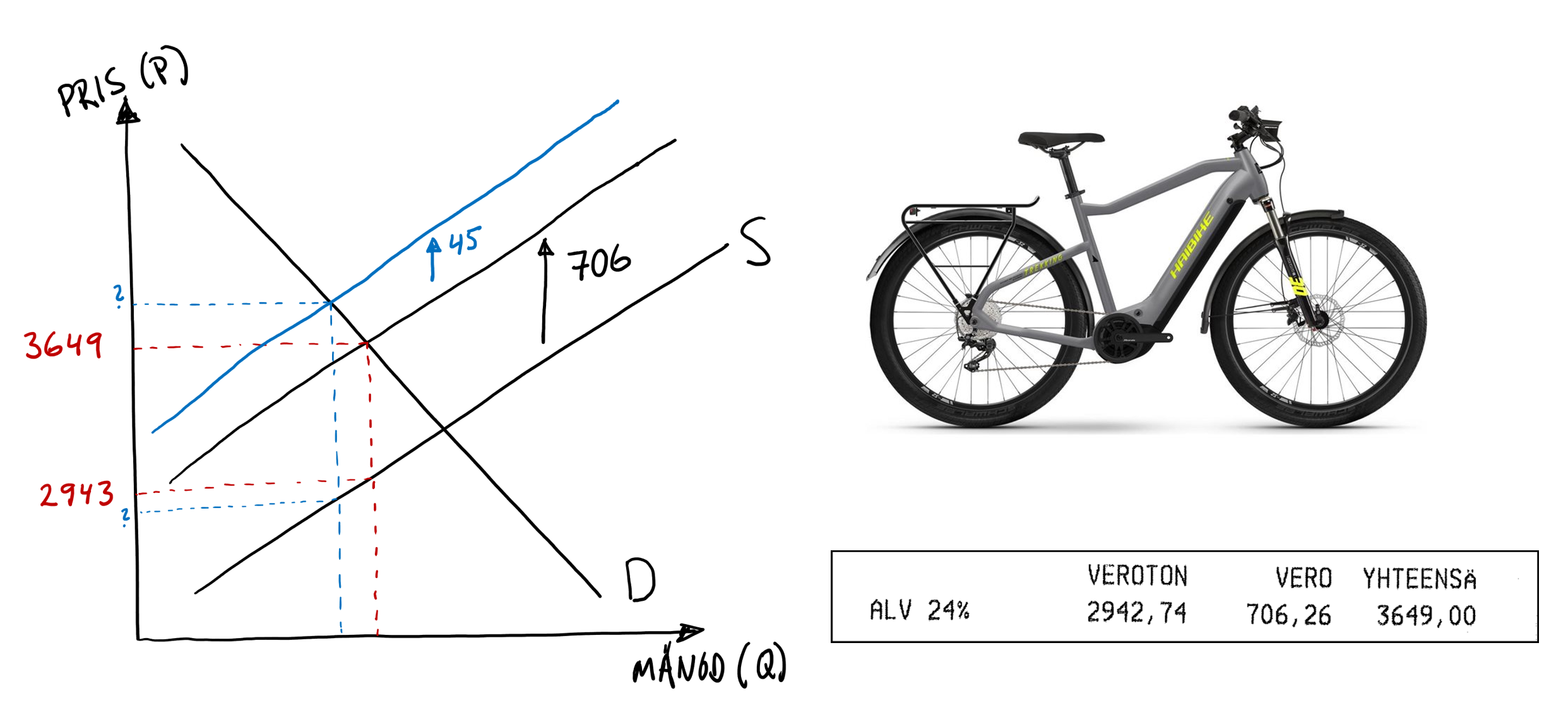 - Före reformen, när momsen fortfarande var 24%, köpte jag en elcykel. I figuren har jag illustrerat jämvikten i rött: Skatten (som motsvarade ungefär 706 euro för min cykel) gjorde att priset för mig som konsument blev 3 649 euro medan cykelbutiken fick 2 943 euro kvar när de skickat in skatten till staten. Momshöjningen innebar att skatten höjdes med ytterligare cirka 45 euro. Vad händer troligen med priset i butiken när momsen höjs? Svar: .