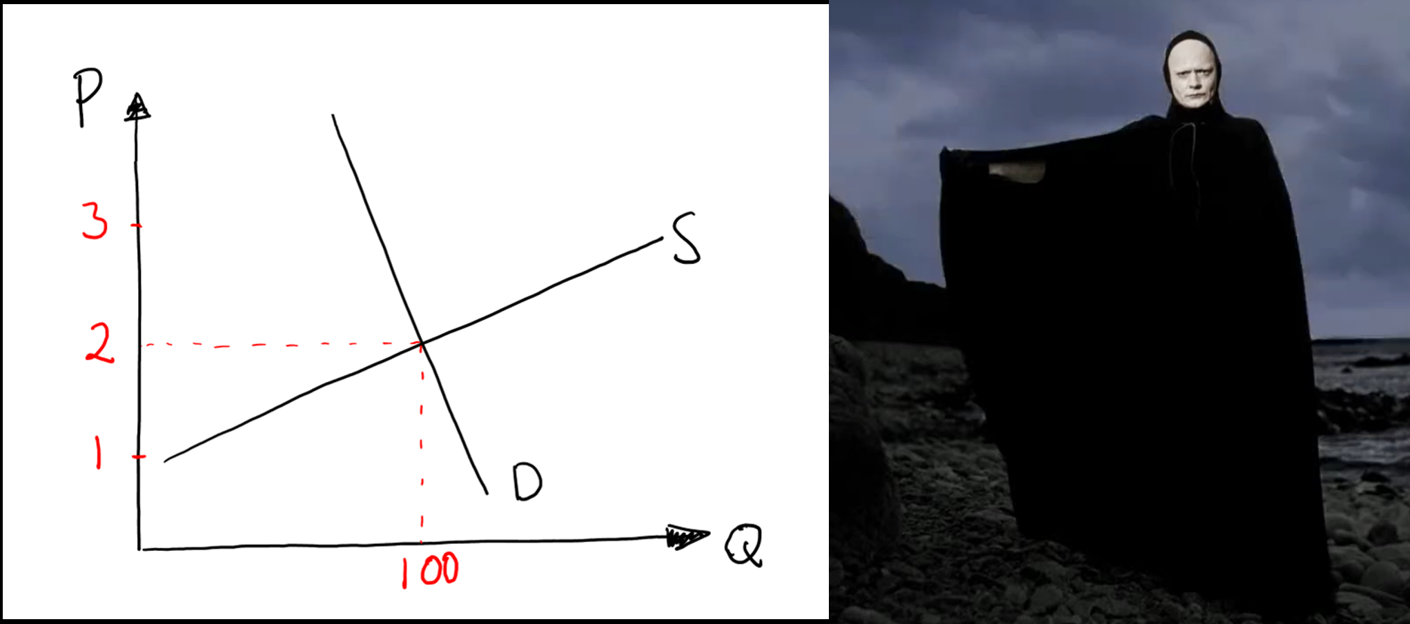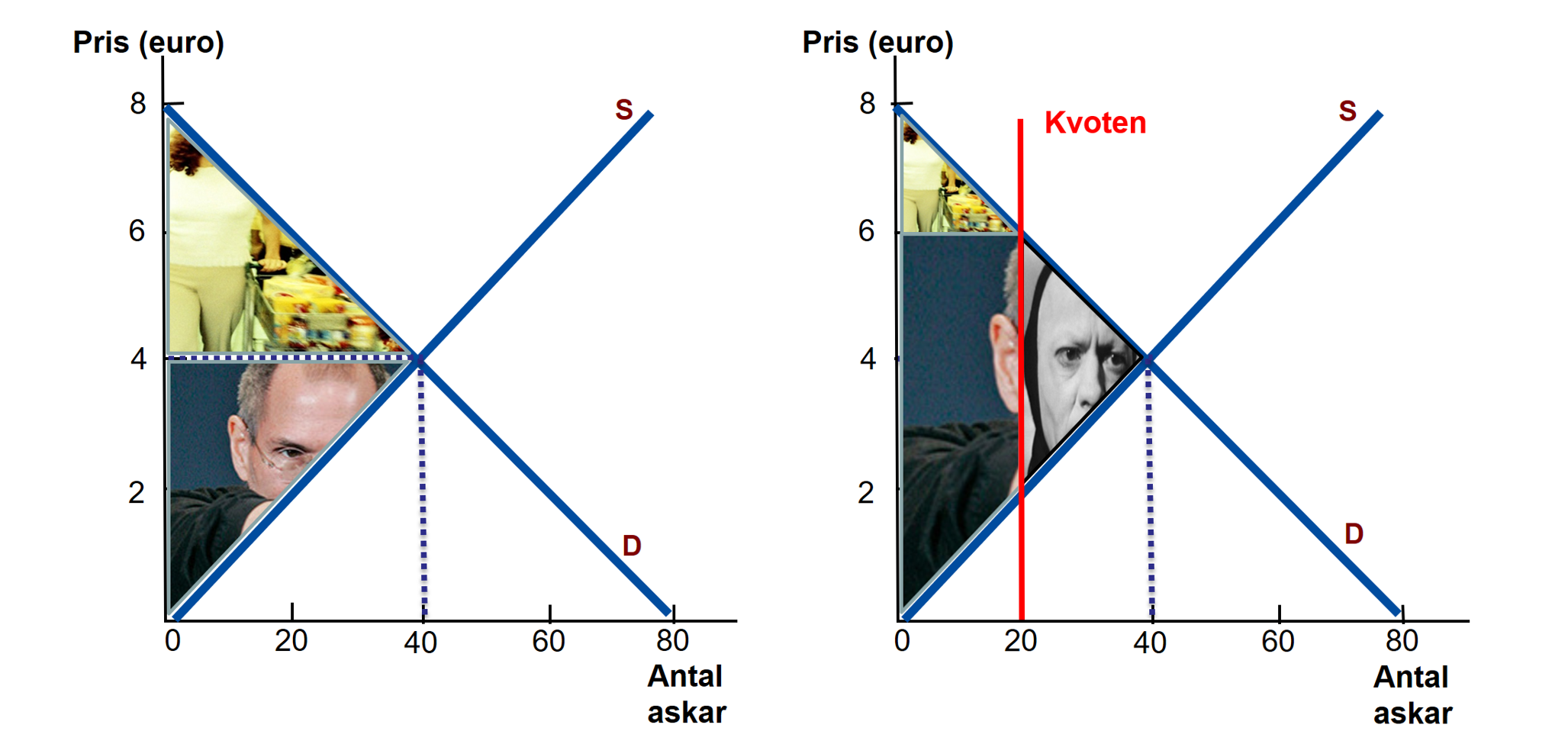 I figurens högra del ser du vad som händer när politikerna begränsar handeln till 20 askar. Det första du kan observera är att handeln blir ineffektivt liten. Hur vet du det? Jo, tänk på marginalen: Vad skulle hända om man fick sälja ytterligare en enhet? Det finns kunder som är beredda att betala nästan 6 euro för ask nummer 21 och det finns försäljare som är redo att sälja asken för lite över 2 euro - men ändå kommer asken inte att handlas. Politikerna har ju dödat möjligheten till det här utbytet, fastän det skulle ha gynnat både köparen och säljaren. Dödviktsförlusten, i figuren illustrerad med Döden, är värdet av allt överskott som går upp i rök när politiker dödar en del av handeln.
