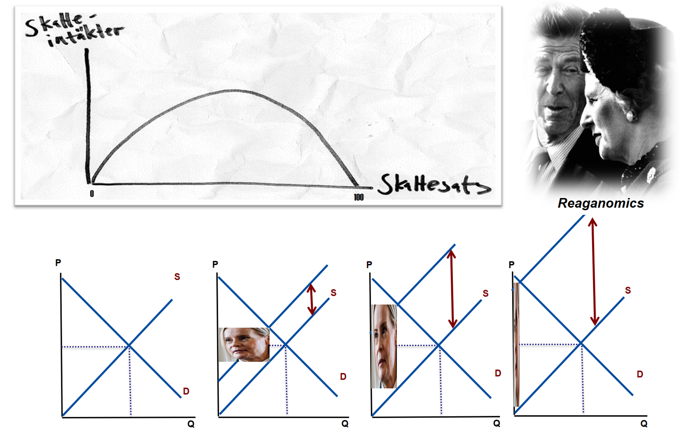 - Skriv upp ett bra svar. Notera att Laffer ritar sin kurva med skattesatsen på den vertikala och skatteintäkterna på den horisontella men det är ju en smaksak.