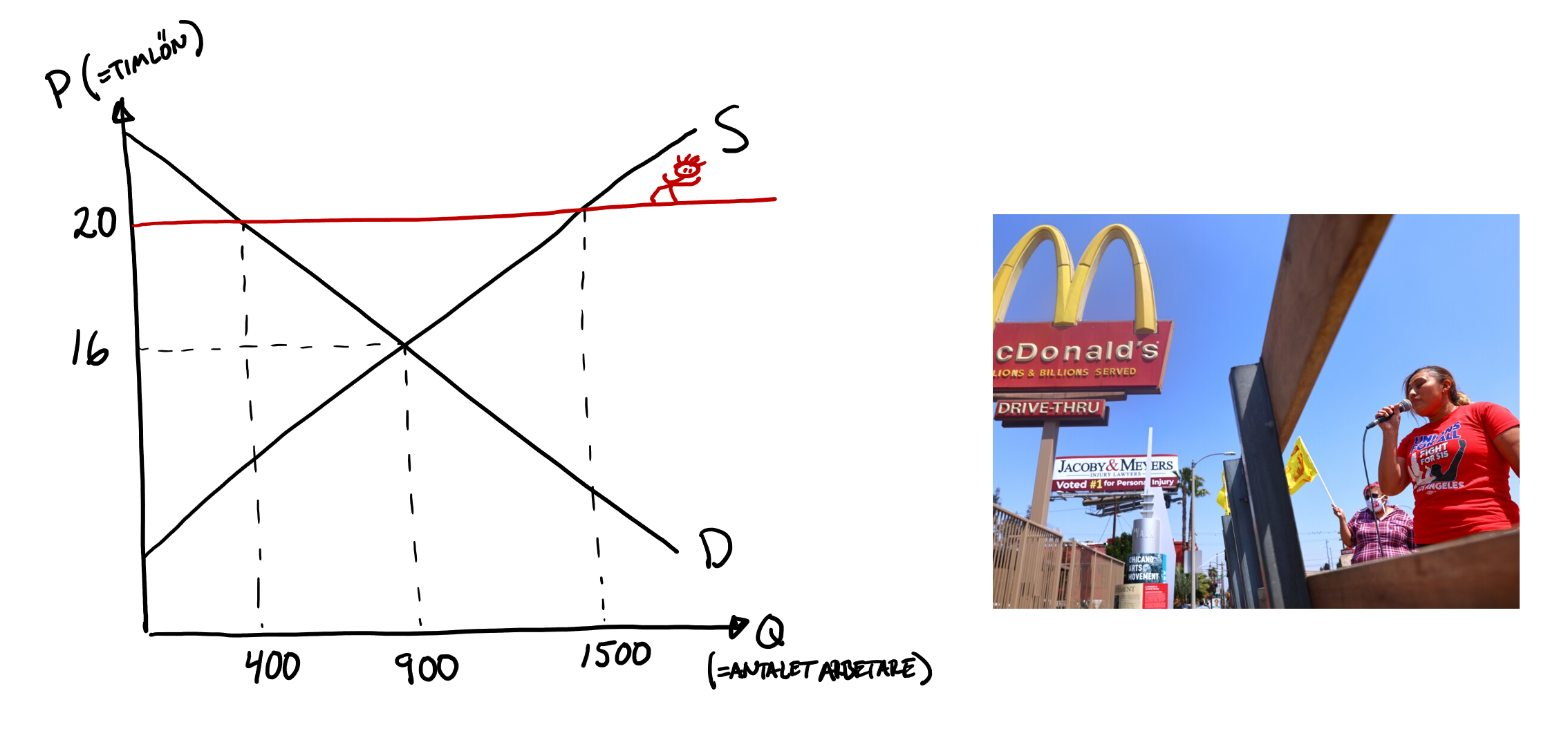 - Facket rasar: “Det är orimligt att arbetare bara ska tjäna 16 dollar i timmen. Arbetarna, ofta studenter, har inte råd att leva!” Facket kräver därför att en minimilön på 20 dollar införs. Antalet arbetare som restaurangerna anställer blir i så fall , medan antalet arbetare som vill bjuda ut sin arbetskraft vid denna höga lön blir .
