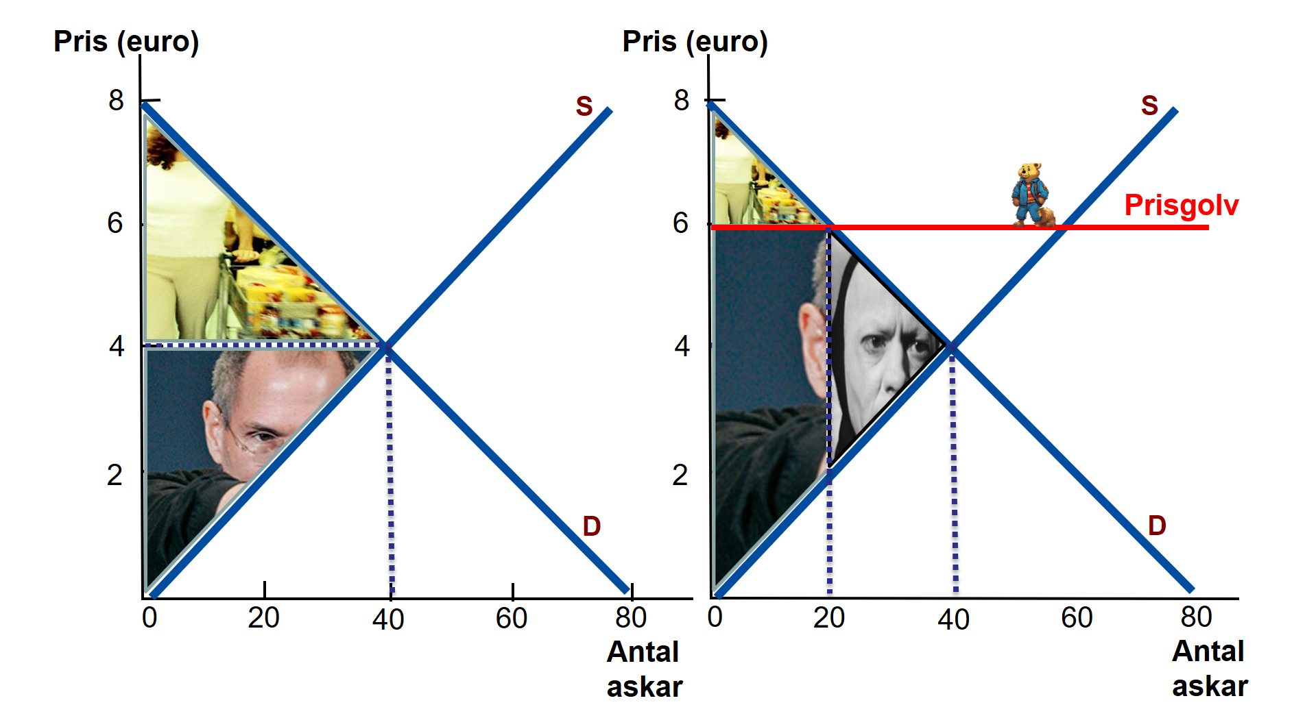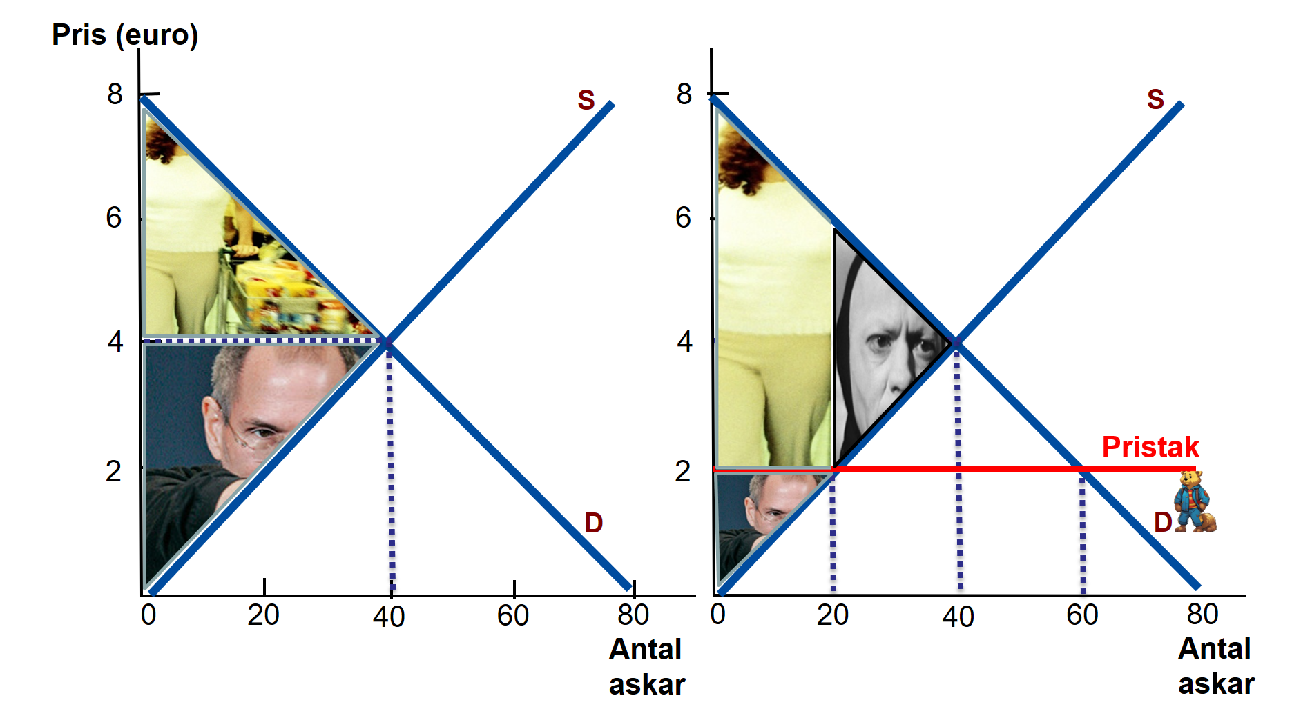 I figurens vänstra del visas den ursprungliga situationen, där 40 askar jordgubbar säljs till ett pris av 4 euro per ask. De båda trianglarna motsvarar konsumentöverskottet (KÖ) och producentöverskottet (PÖ).