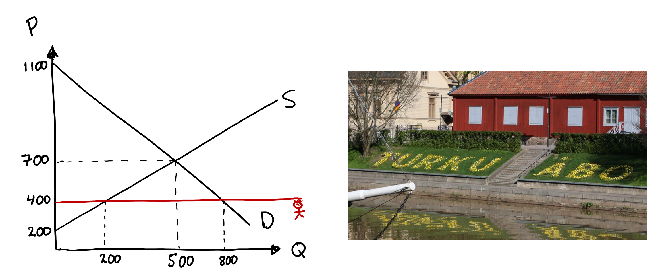 Det är lätt att få ett förstahandskontrakt på en bostad i Åbo centrum, men nästan omöjligt i Stockholm city. Varför är det egentligen så? Anta att följande skiss visar utbudet och efterfrågan på små hyresrätter i Åbo. Om du vill läsa mer om bostadsmarknaden i Sverige vs Finland kan du läsa här.