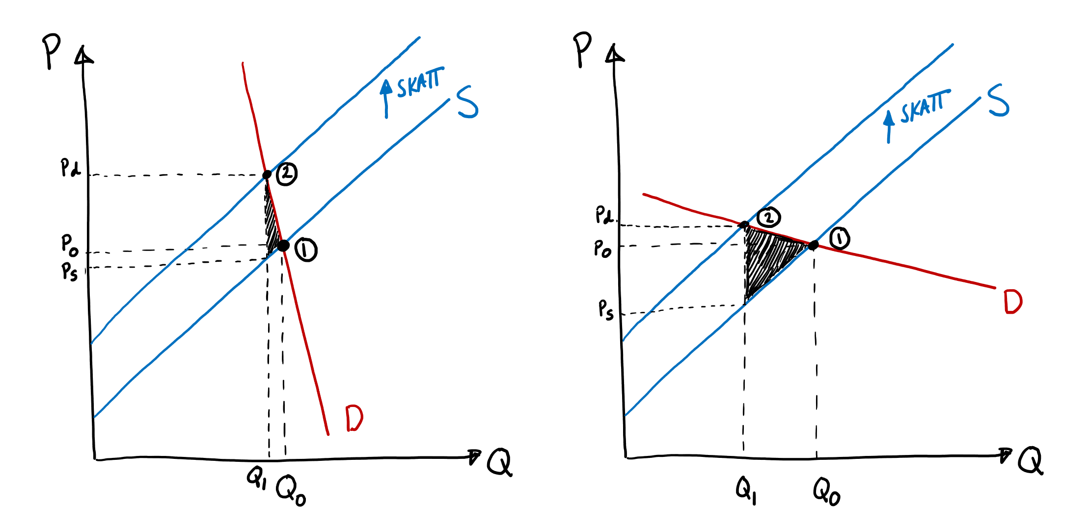 Notera också att skatteintäkterna blir större och dödviktsförlusterna mindre i den vänstra grafen än i den högra. Varför blir det så? Jo, för att konsumenterna är okänsliga för prishöjningar. De kommer därför att fortsätta handla även när staten inför en skatt. I den högra grafen däremot dödas en stor del av handeln när skatten införs - och därför finns det mindre handel kvar att samla upp skatter från. Ur ett rent effektivitetsperspektiv är det därför bra att beskatta till exempel boende, cancermediciner och andra varor och tjänster där efterfrågan är oelastisk med avseende på priset. Å andra sidan kanske det är värt att offra lite effektivitet för något som vi upplever som mer rättvist?