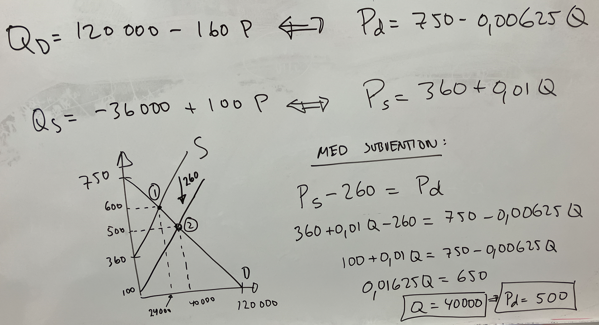 - Tänk dig att universiteten får 260 för varje student. Detta kommer att skifta ner utbudskurvan med subventionens storlek. Den nya utbudskurvan blir därför \(\small P_S=100+0,01Q\). Nu kan du räkna ut den nya terminsavgiften för studenterna.