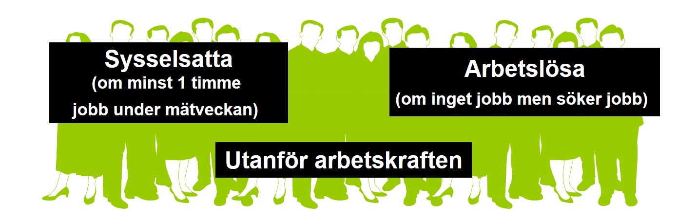 Innan vi analyserar hur arbetsmarknaden fungerar är det bra att känna till några centrala begrepp. I följande figur har jag ritat ut ett av de vanligaste måtten inom samhällsekonomin.