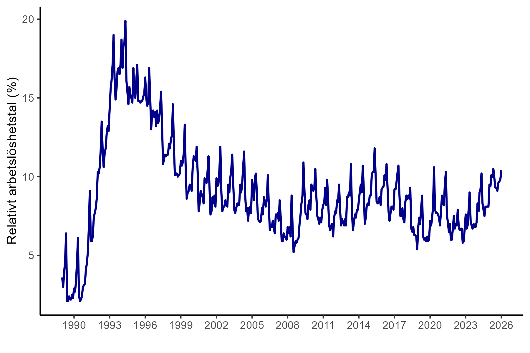 Med de här siffrorna kan du se flera olika mått på hur arbetsmarknaden ser ut. Det relativa arbetslöshetstalet visar andelen arbetslösa i procent av hela arbetskraften (de som är antingen sysselsatta eller arbetslösa). Just nu är det relativa arbetslöshetstalet alltså ungefär 10,44 procent. Du får siffran genom att ta antalet arbetslösa och dividera med summan av de arbetslösa plus de sysselsatta, och så kan du multiplicera kvoten med 100 för att få arbetslösheten i procent.