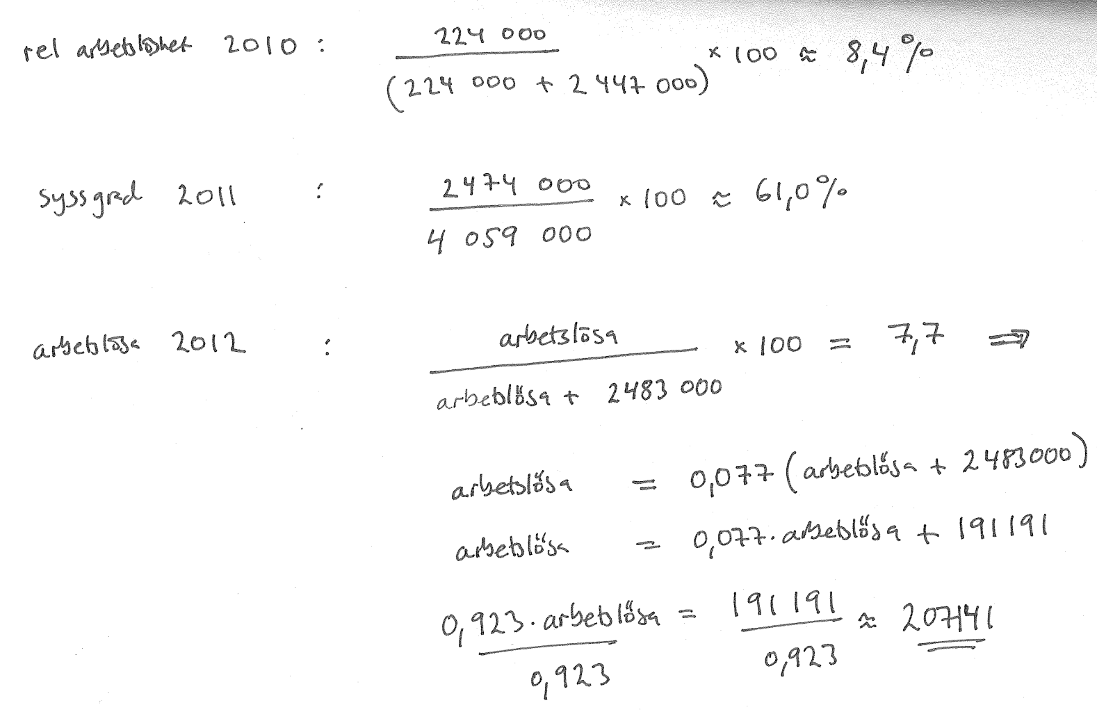 - Utgå från formlerna i Avsnitt 16.1. På vissa av deluppgifterna måste du vara lite klurigare; i en av uppgifterna vet du till exempel det relativa arbetslöshetstalet och antalet sysselsatta, men du vet inte hur många som är arbetslösa. Ett sätt att få rätt på uppgiften är att testa med de olika svarsalternativen och se vilket som blir rätt, men ett smartare sätt är att lösa uppgifterna “analytiskt” enligt nedan: