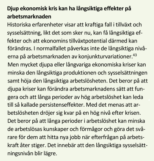 Det är alltså inte bara under själva arbetslöshetstiden som du får det knapert. Effekten sitter i länge. Det verkar alltså som att en tillfälligt hög arbetslöshet – till exempel på grund av en pandemi – också orsakar permanenta skador på ekonomin. En tillfällig nedgång lämnar liksom ärr som aldrig försvinner. Fenomenet kallas för hysteresis. Du kan tänka att tiden som arbetslös gör att du förlorar kompetens. Bitar av det som du har lärt dig faller i glömska. När du väl hittar ett arbete igen är du inte riktigt samma person som du var tidigare. Det är som om LRAS-kurvan plötsligt har skiftat en aning åt vänster.