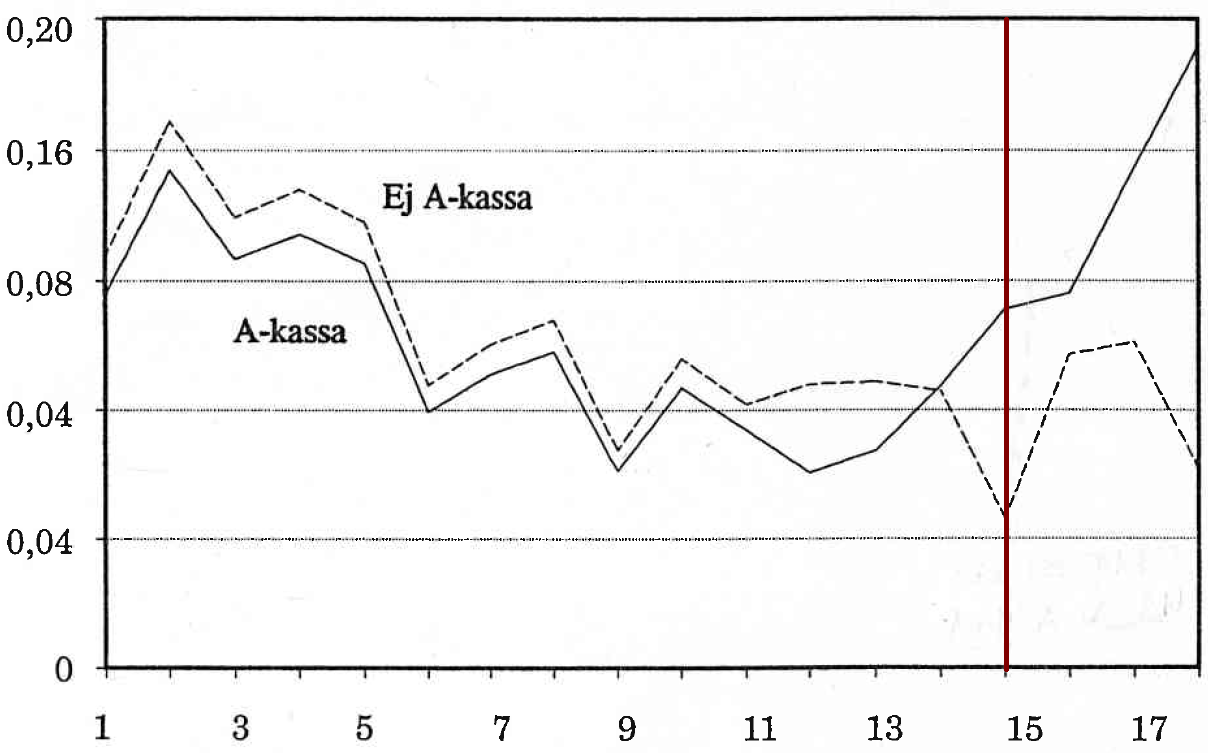 Stärk drivkrafterna att söka jobb! Figuren nedan har jag tagit från Carling m.fl. (2001), som följer tusentals personer som blev arbetslösa vid en viss tidpunkt. På den horisontella axeln ser du hur många veckor som gått sedan de blev arbetslösa, medan den vertikala axeln visar hur stor andel av personerna som fick ett jobb varje vecka. Hälften av gruppen hade en arbetslöshetsersättning (A-kassa), medan den andra hälften inte hade det. Ersättningen gavs bara i 14 veckor, och efter det upphörde den helt.