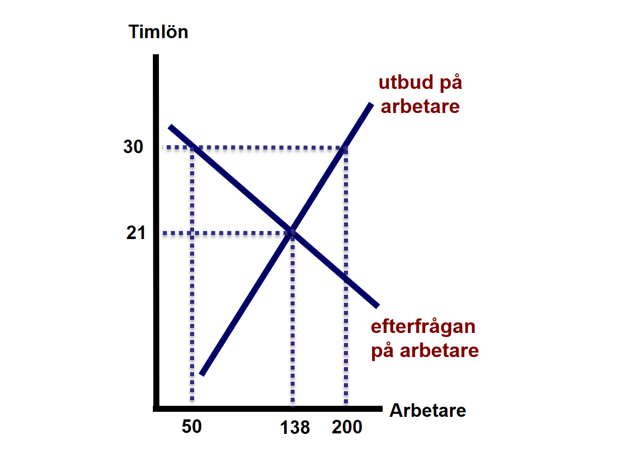 Den vertikala axeln visar timlönen och den horistontella axeln antalet arbetare. Utbudskurvan visar hur många studenter som vill arbeta som kursassistent vid olika löner. Om timlönen exempelvis är 21 euro anmäler 138 ÅA-studenter sitt intresse, men om lönen ökar till 30 euro vill 200 ha jobbet. Efterfrågekurvan visar hur många kursassistenter alla ämnen vid Åbo Akademi vill anställa vid olika löner. Kurvan lutar nedåt, vilket betyder att universitetet vill anställa fler när lönen är låg.