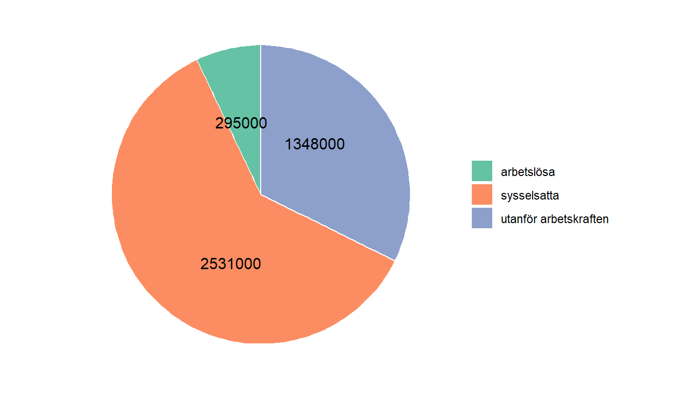 Du räknas alltså som sysselsatt om du har jobbat minst en timme under den vecka som mätningen görs. Om du däremot säger att du inte har ett jobb men aktivt söker, så räknas du som arbetslös. Tillsammans kallas de som är sysselsatta eller arbetslösa för arbetskraften. Resten står utanför arbetskraften. Hit hör bland annat pensionärer, studenter och personer som känner att det inte längre är någon idé att söka efter jobb. Så här såg arbetsmarknaden ut i januari 2026 för personer mellan 15 och 74 år: