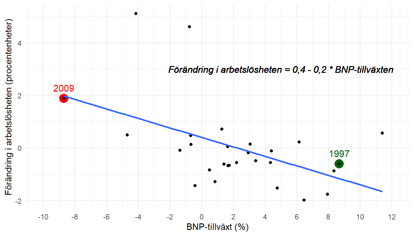 Den horisontella axeln visar den ekonomiska tillväxten och på den vertikala axeln ser du hur arbetslösheten har förändrats från år till år. Varje prick visar läget i Finland under ett visst år. Till exempel visar den röda pricken längst till vänster hur läget såg ut år 2009. Det året krympte BNP med 8,7 procent. Samtidigt steg arbetslösheten med 1,9 procentenheter. Den gröna pricken nästan längst till höger i figuren visar i stället läget i Finland år 1997, då BNP växte med 8,7 procent och arbetslösheten sjönk med 0,6 procentenheter (från 15,6 procent till 15,0 procent).