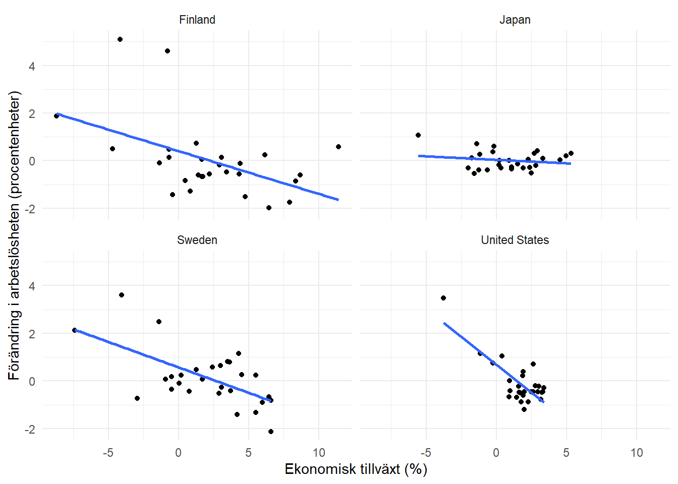 De fyra graferna ovan visar hur Okuns lag såg ut i Finland, Sverige, Japan och USA under åren 1991-2019. Som du ser verkar det finnas tydliga skillnader mellan länderna. I Japan verkar det inte hända speciellt mycket alls med arbetslösheten när tillväxten ändras. Japanerna verkar därför inte behöva oroa sig speciellt mycket över att bli av med jobbet när ekonomin bromsar in. Å andra sidan går arbetslösheten heller inte ned speciellt mycket i goda tider. I USA är sambandet betydligt starkare: Låg ekonomisk tillväxt, vilket är typiskt för lågkonjunkturer, resulterar i USA i kraftigt högre arbetslöshet. I Sverige verkar tillväxten ha ungefär samma effekt på arbetslösheten som i Finland.