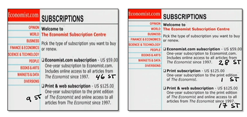 Exempel 4: För några år sedan lät jag studenterna tycka till om olika autentiska prenumerationspaket på tidskriften Economist. Halva gruppen fick välja mellan de två paketen till vänster här nedanför: Att köpa den digitala versionen för 59 dollar eller betala 125 dollar och få tidskriften i både tryckt och digital form. Endast drygt 16 procent valde det dyrare paketet.