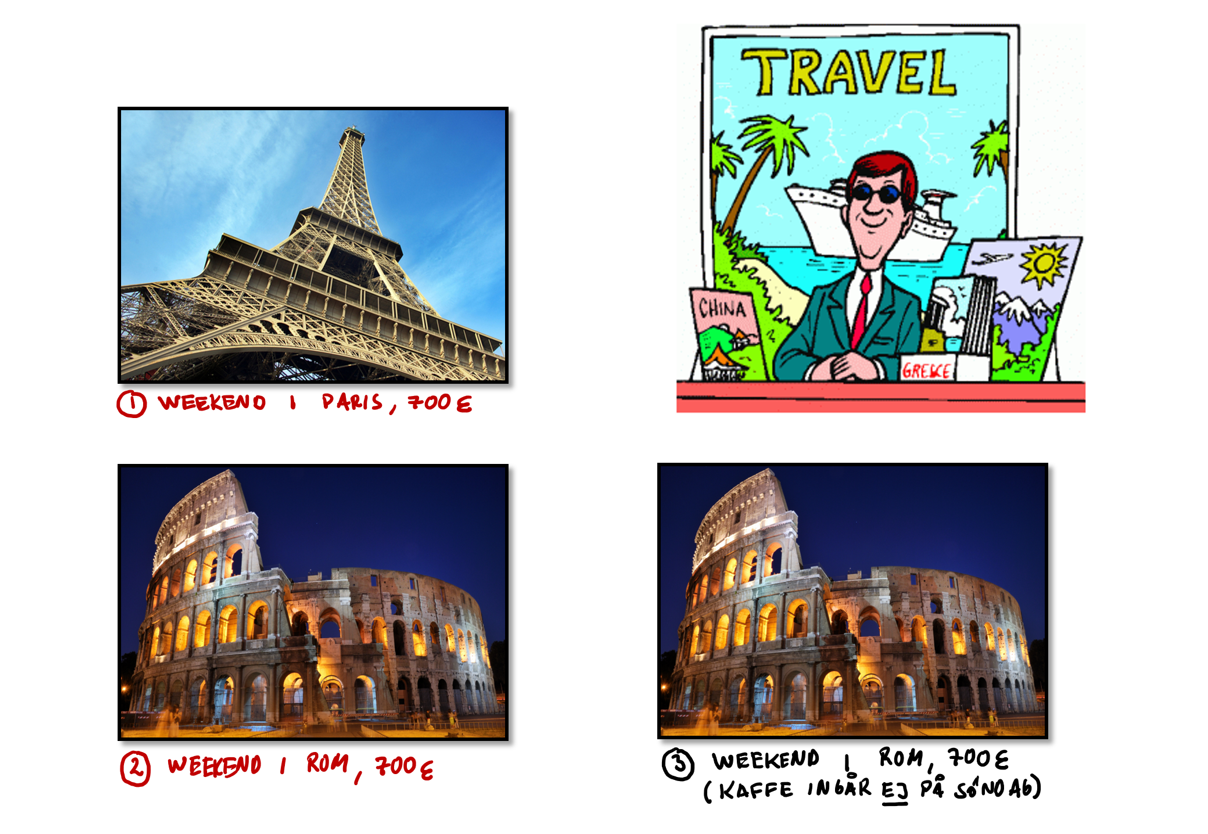 Men nu inför du plötsligt ett tredje alternativ. Det här är också en weekend i Rom och även här är priset 700 euro. Även här ingår bussresa, mat, utställningar, guide och underhållning. I själva verket är resan en exakt kopia av den andra resan till Rom, men med en minimal skillnad: I det nya paketet ingår inte gratis kaffe till lunch på söndagen. Hur tror du att det nya paketet påverkar din försäljning?