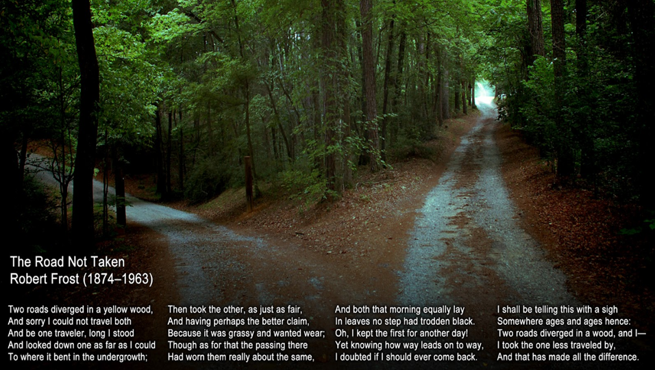 Jag brukar likna beslutsfattande vid att stå vid ett vägskäl i skogen. Vilken väg du väljer beror på vilken väg som gör ditt liv bäst. Poeten Robert Frost tänker tillbaka på sina livsval i dikten The road not taken: