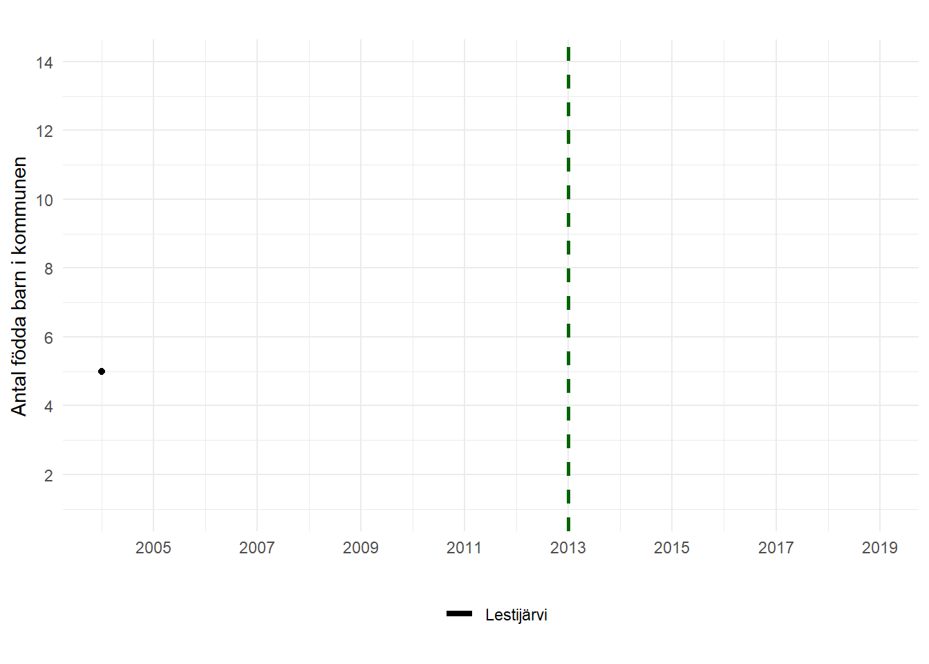 Det finns många sätt att mäta hur världen ser ut. På Statistikcentralens hemsida laddade jag hem ett Excel-dokument som visade exakt hur många barn som har fötts i varje kommun i Finland. Här nedanför har jag låtit datorn rita en figur som visar barnafödandet i Lestijärvi under åren 2004–2019. Den gröna linjen markerar när reformen infördes. Hur tolkar du figuren?