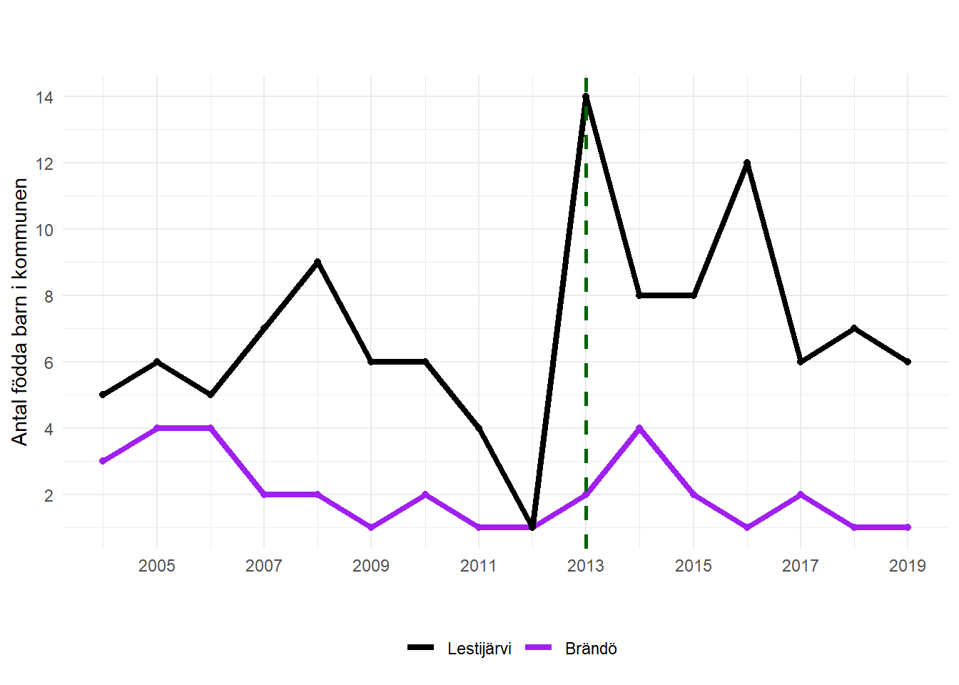 Ett smart sätt att hantera detta problem är att se vad som hände med barnafödandet i andra finländska glesbygdskommuner som inte införde bonusen. Vad hände till exempel med antalet barn i Brändö kommun? Om vi ser samma ökning i barnafödandet i Brändö som i Lestijärvi, skulle det tyda på att boomen i Lestijärvi inte berodde på bonusen, utan snarare på någon annan faktor som påverkade barnafödandet generellt. I följande figur ser du svaret: