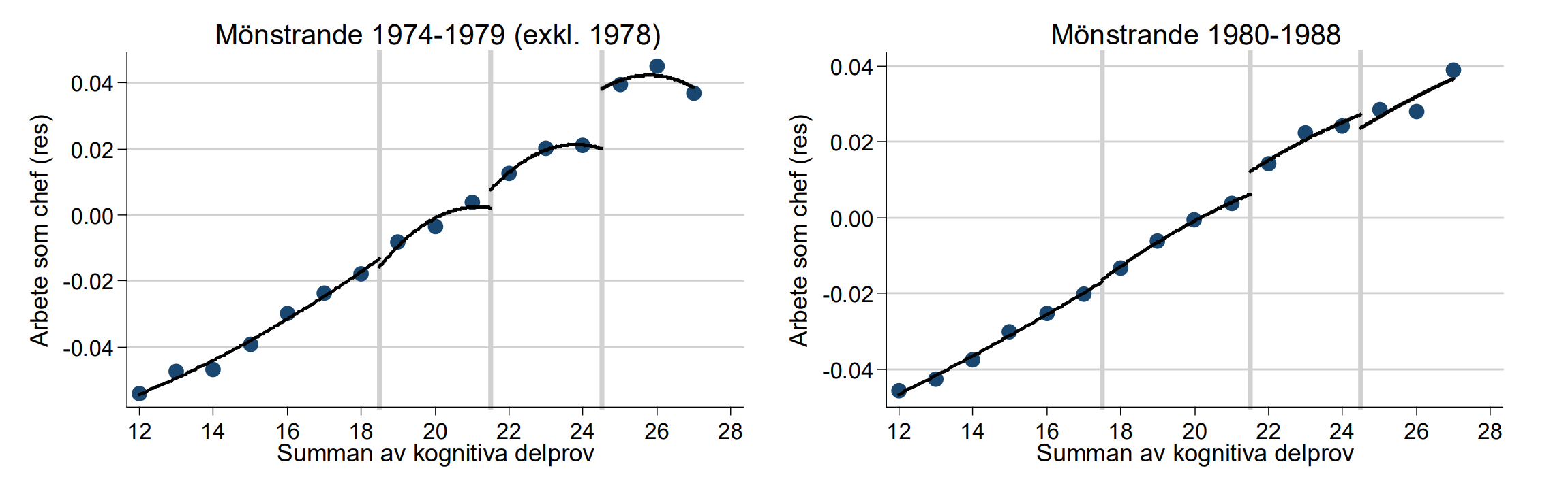 Ta först en titt på den vänstra figuren som visar sambandet under 1970-talet. Du ser att sambandet är positivt; individer som presterar bra på testerna har en betydligt större chans att senare arbeta som chef.