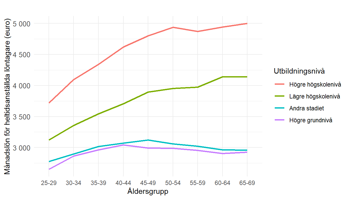 Finländare i åldern 30–34 och med en högre högskoleexamen har alltså en månadslön på cirka 4 200 euro medan personer i samma ålder utan högskoleexamen bara tjänar 2 800 euro. En naiv betraktare skulle förmodligen säga att en högre universitetsexamen höjer din lön från 2 800 euro till 4 200 euro, vilket motsvarar 50 procent.
