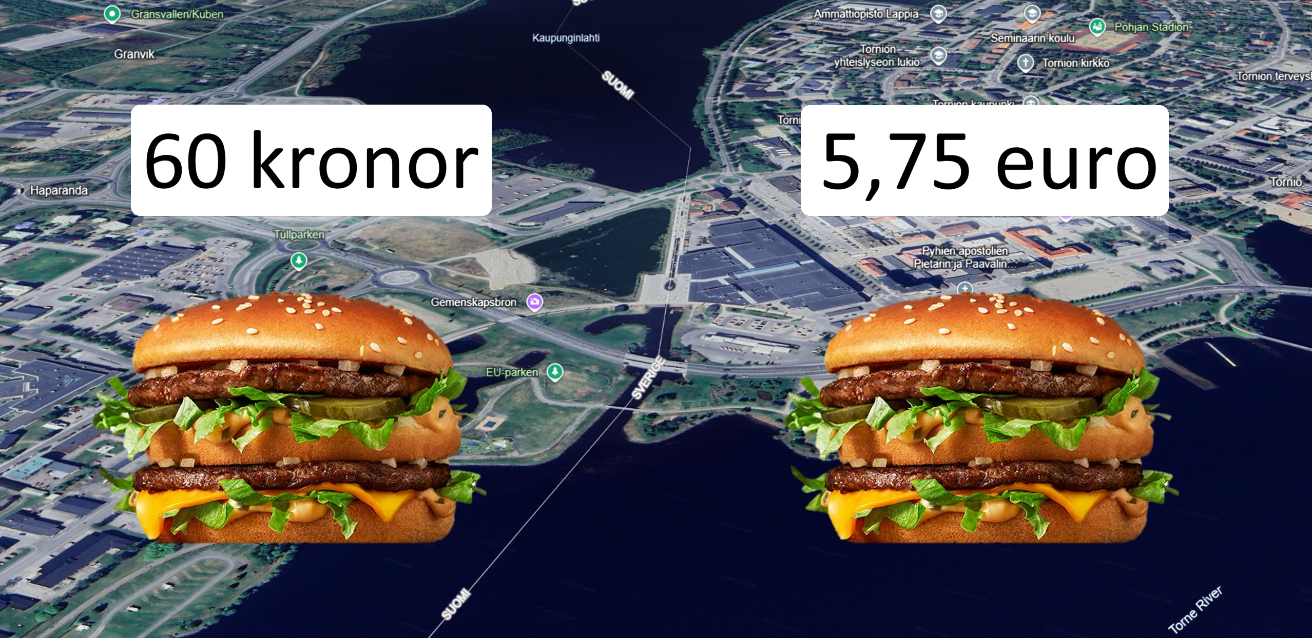 Gör nu följande tankeexperiment: Du befinner dig i Torneå den 12 februari 2025. I fickan har du 5,75 euro. Det innebär att du har råd med precis en Big Mac om du handlar den i Torneå. Men vad händer om du i stället köper din Big Mac i Haparandra? I så fall måste du först växla dina euron till svenska kronor. Eftersom växelkursen är 11,25 kronor per euro får du nästan 65 kronor när du säljer dina 5,75 euro. Med 65 kronor i fickan stegar du in på McDonald’s i Sverige och upptäcker till din förvåning att pengarna räcker gott och väl — du får till och med en slant över. Tydligen var en Big Mac billigare i Sverige än i Finland i början av februari 2025.