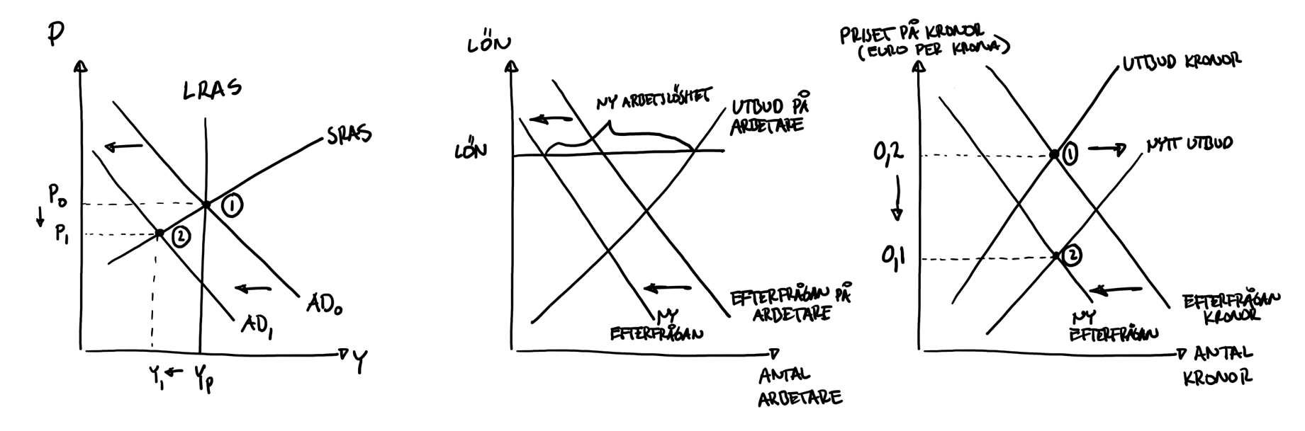 - Tips: Förklara dina svar utifrån figurerna nedan. Panik och minskade förmögenheter leder troligen till att AD faller, vilket på kort sikt leder till lägre BNP (från 1 till 2 i figuren längst till vänster). Företagen kommer då att vilja ha färre anställda; om lönerna är låsta så resulterar det i att fler blir arbetslösa. Krisen i ekonomin kommer troligen att göra det mindre attraktivt att ha med Sverige att göra: efterfrågan på den svenska kronan kommer förmodligen att minska (eftersom färre behöver kronor för att göra saker i Sverige) och utbudet av kronor kommer att öka (eftersom fler vill bli av med sina kronor då man inte vill göra saker i Sverige längre). Resultatet blir att kronan faller i värde gentemot euron.