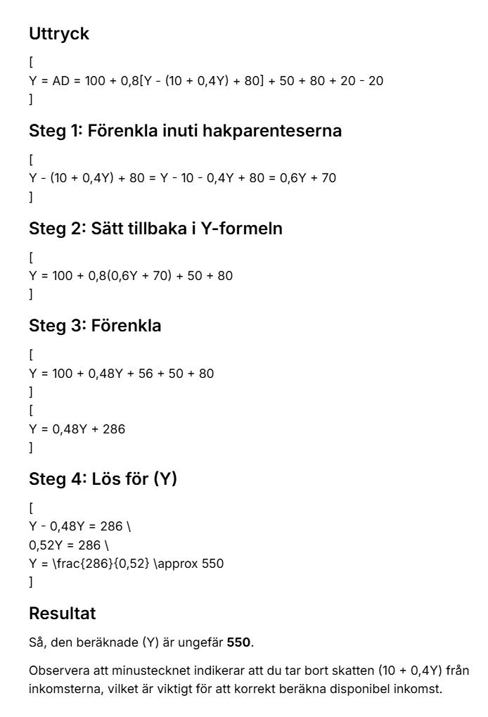 - Använd gärna appen längre upp i kapitlet. Får du till det? Tricken är att tänka att Y=AD=C+I+G+EXPORT-IMPORT. Sätt sedan in allt du vet om dessa och försök att räkna ut landets BNP. Y=AD=100+0,8[Y-(10+0,4Y)+80]+50+80+20-20. Var försiktigt med minustecknet. Jag lät ChatGPT ta fram att Y blir 550 (här). Vår faktiska BNP ligger alltså 50 över den potentiella nivån, vilket motsvarar 10%. När du vet att Y=550 kan du ta fram den offentliga sektorns inkomster (alltså skatterna) och jämföra med dess utgifter (alltså offentlig konsumtion och transfereringar). Vi får ett budgetunderskott på 70, vilket motsvarar cirka 12,7% av BNP.