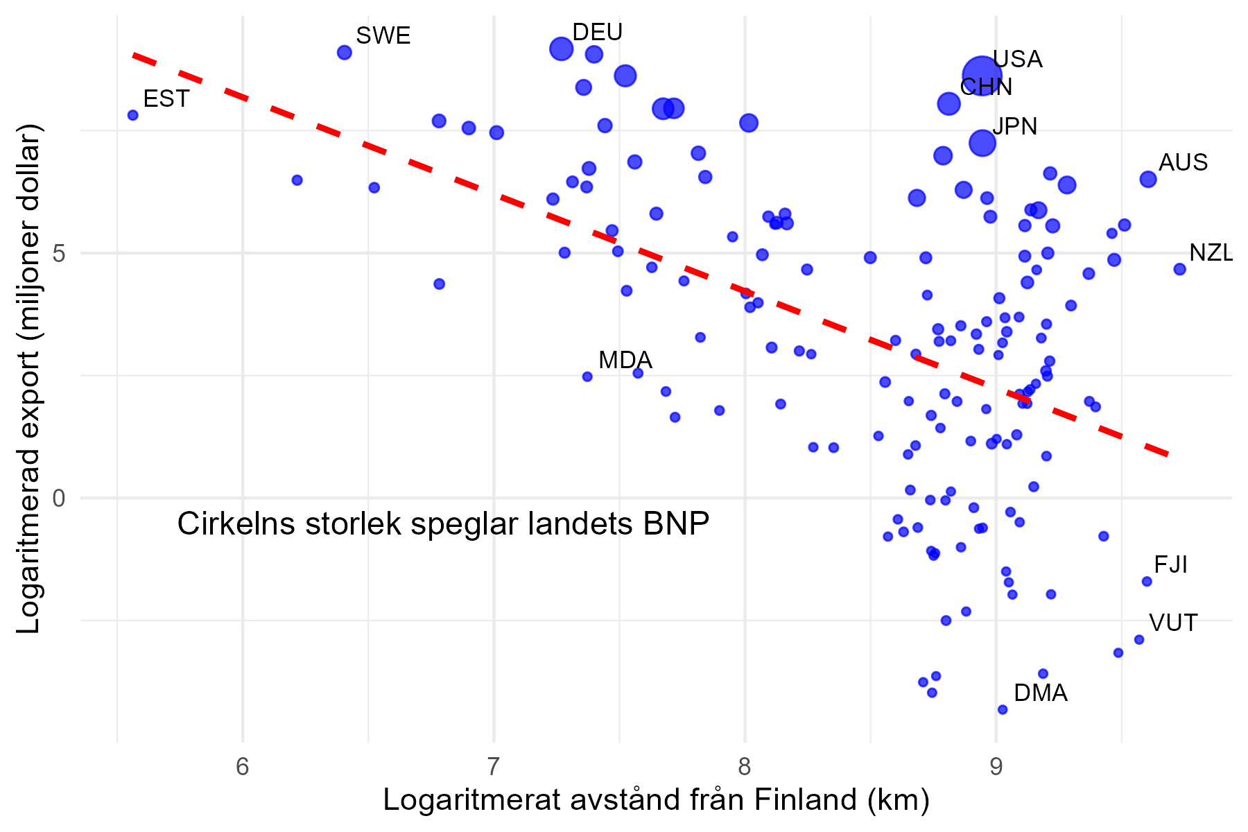 - Avståndet spelar roll: Den streckade röda linjen indikerar ett klart mönster. Finland handlar generellt mycket mer med länder som ligger nära, som Estland (EST) och Sverige (SWE). Vår handel med mer avlägsna länder, som Fiji (FJI) och Australien (AUS), är betydligt mindre. Detta visar att avstånd fortfarande är en viktig faktor för att förstå världshandeln.