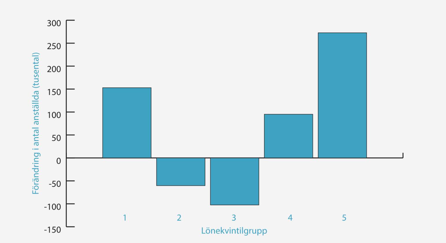 Forskarna delade först upp alla yrken i fem lika stora grupper baserat på lönerna år 1975. Lönekvintilgrupp 1 omfattar yrken med lägst lön (som frisörer och städare), medan grupp 5 innehåller de bäst betalda yrkena (till exempel kirurger och ekonomer). Den vertikala axeln visar förändringen i antalet personer som arbetar inom dessa yrken i dag jämfört med 1975. Du ser att antalet lågbetalda och högbetalda jobb har ökat, medan jobben i mittensegmentet har blivit färre. Detta tyder på att samhället har polariserats och att klyftorna har ökat.