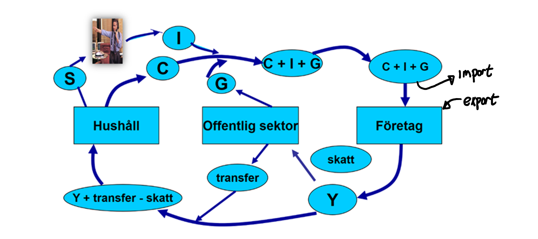 Om du har förstått hur vi analyserar en sluten ekonomin, kommer det att vara relativt enkelt att förstå en ekonomi som har kontakter med omvärlden. Det enda du behöver göra är att tänka på det samhällsekonomiska kretsloppet men med en twist:
