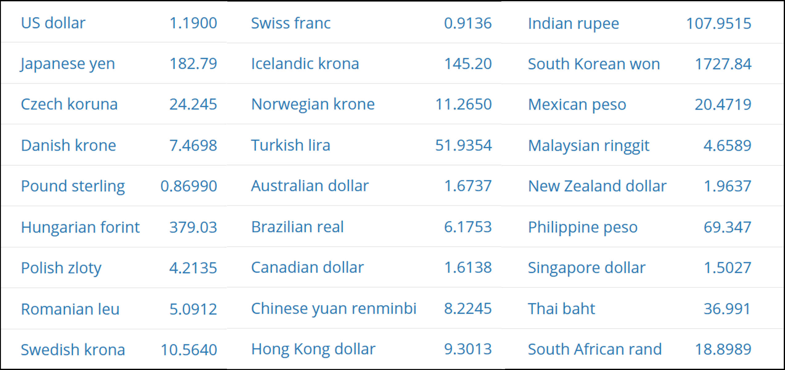 Växelkursen visar med andra ord hur mycket av den andra valutan som du måste betala för att köpa en euro. Eftersom det finns många olika valutor – euro, dollar, kronor, yen osv – finns det också många olika växelkurser. Varje växelkurs visar hur mycket av den andra valutan som du måste ge upp för att få en euro. I listan här nedanför ser du värdet på euron när jag skriver det här klockan 16:38 torsdagen den 12 februari 2026: