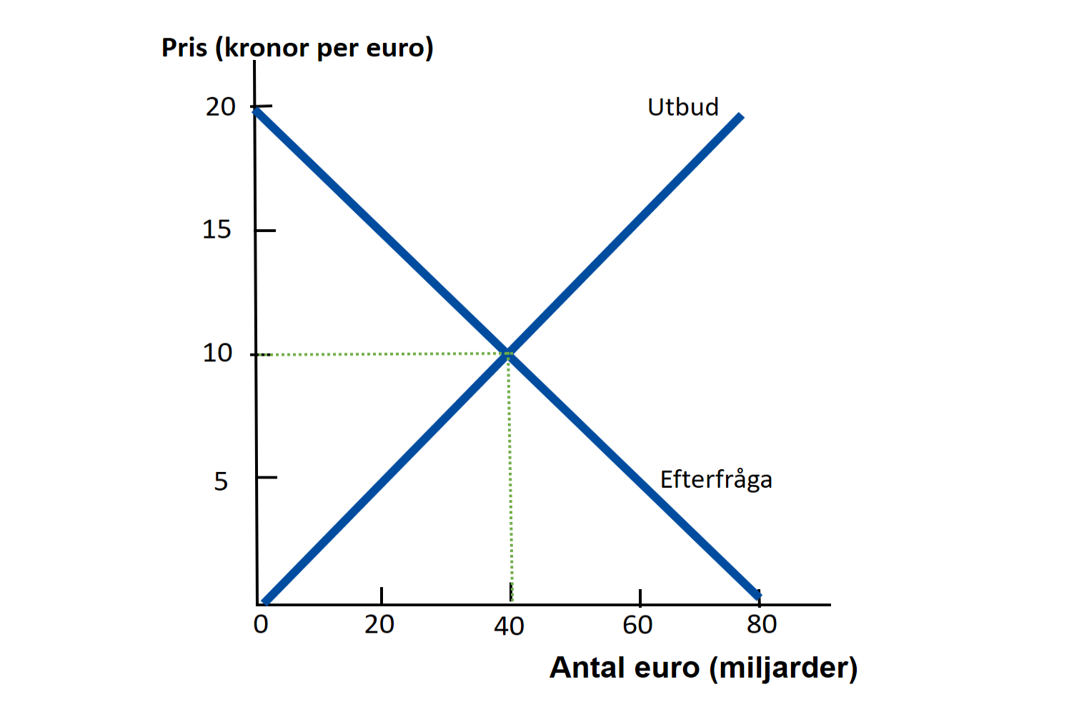 Utbudet visar hur mycket euro som säljarna (du) vill sälja och efterfrågan visar hur mycket euro som köparna (jag) vill köpa. Förstår du varför utbudskurvan lutar uppåt? Kom ihåg att en stark euro innebär att du får många kronor i utbyte mot varje euro. Det gör att du får mycket pengar med dig på din Stockholmsresa. Att det är billigt i Stockholm borde leda till att fler finländare tycker att en semesterresa i Sverige låter som ett bra alternativ. Därför kommer fler att vilja sälja sina euron ju starkare euron är.