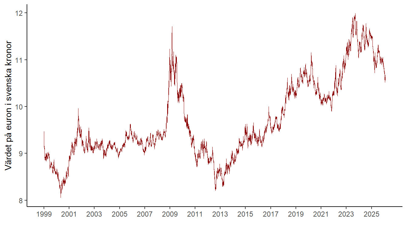 Titta på den här figuren över hur värdet på euron (uttryckt i kronor) har utvecklats sedan euron skapades 1999.